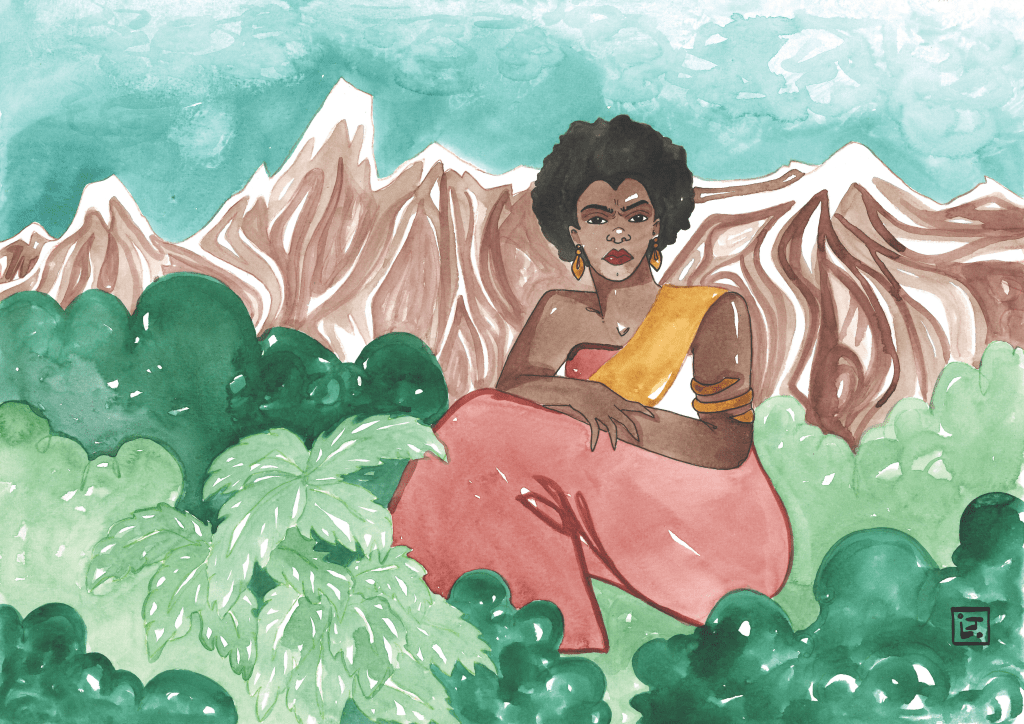 Wolfskin seeks to emphasize this connection particularly with women. “Everytime I draw different scenes, the energy always matches with the woman. I want people to feel like it’s just one entity and to put the woman in a place where she is authentic and valuable and she deserves to be here. She’s part of planet Earth and she’s an element that you can’t remove.” This shines through in her artwork, which consists mainly of portraits of Black women and often includes elements of plants and animals. The women exist unapologetically as Wolfskin allows their body, hair, and face to take up space on the page and create balance within their environment.